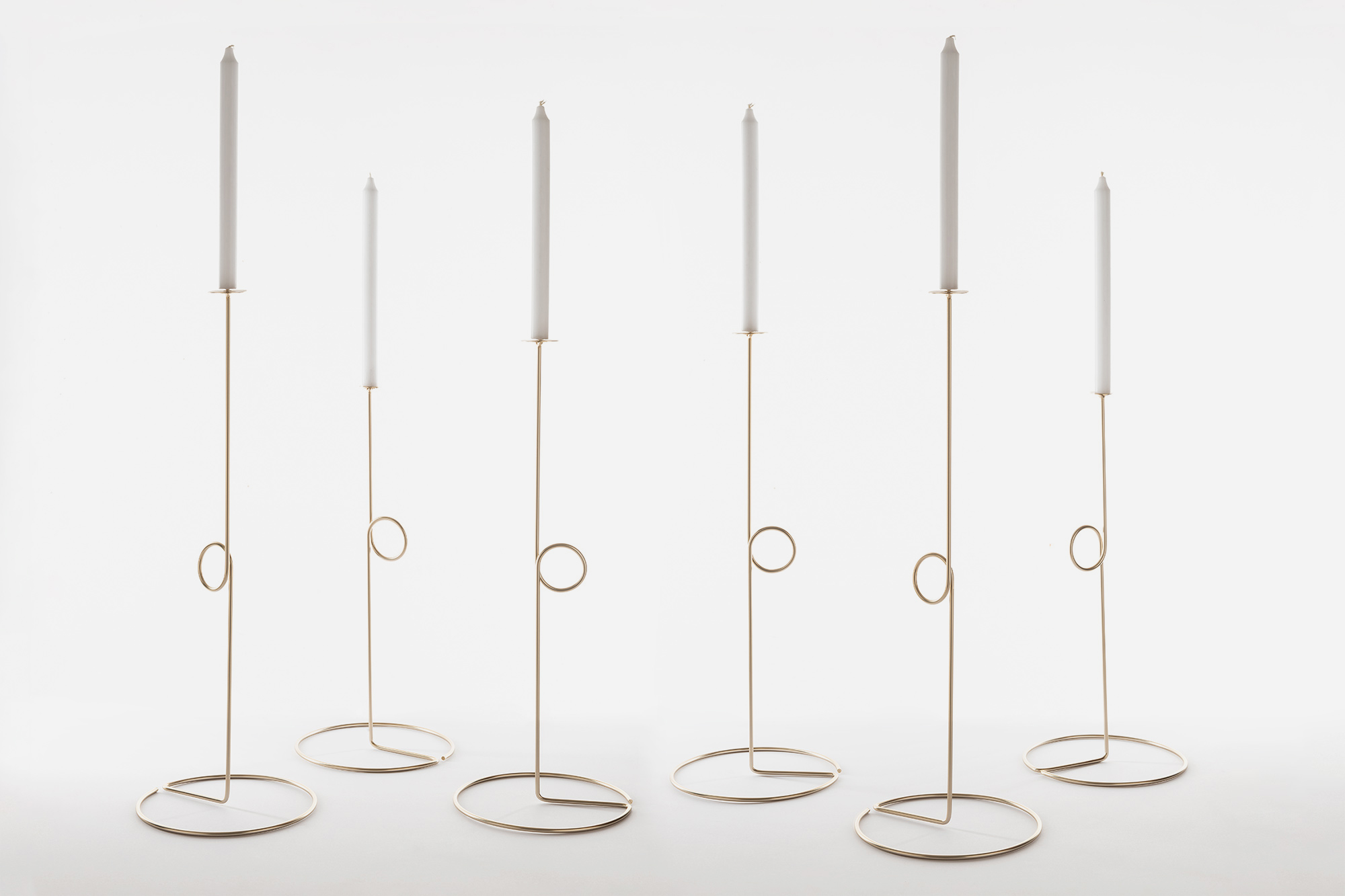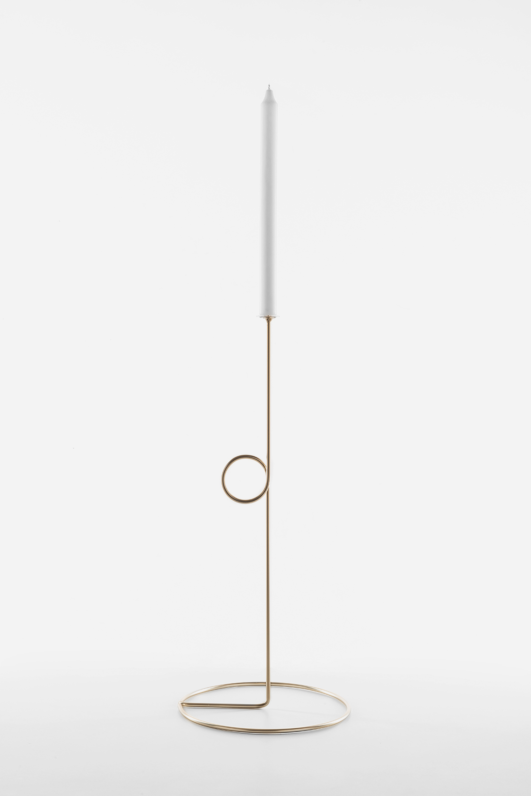 One light bent metal rod designs a candle holder. The loop is the handle.