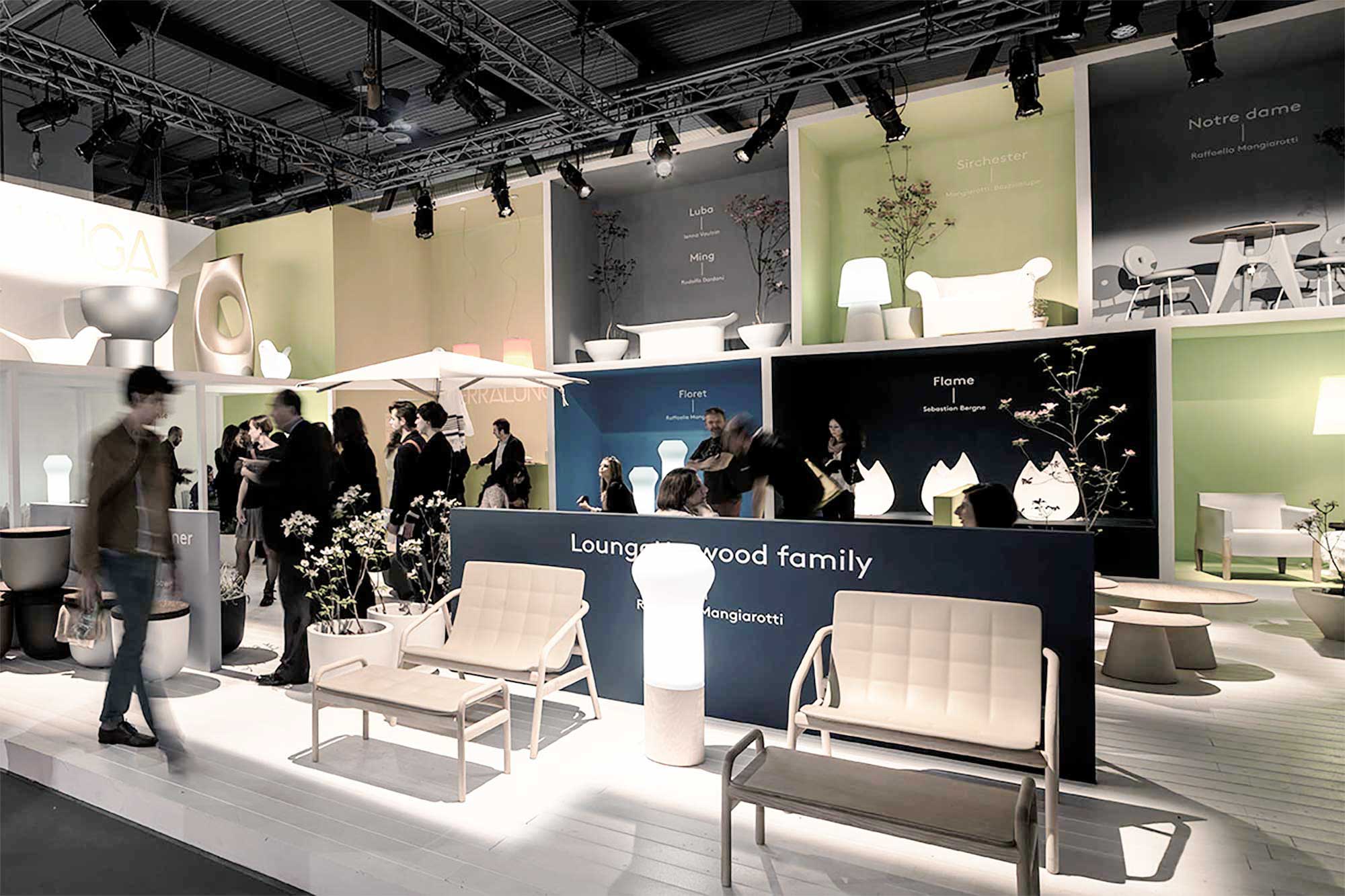 The booth recreates small micro-areas with colored boxes containing furniture, vases and lights. The layout shows the versatility of the products in residential and contract spaces.
